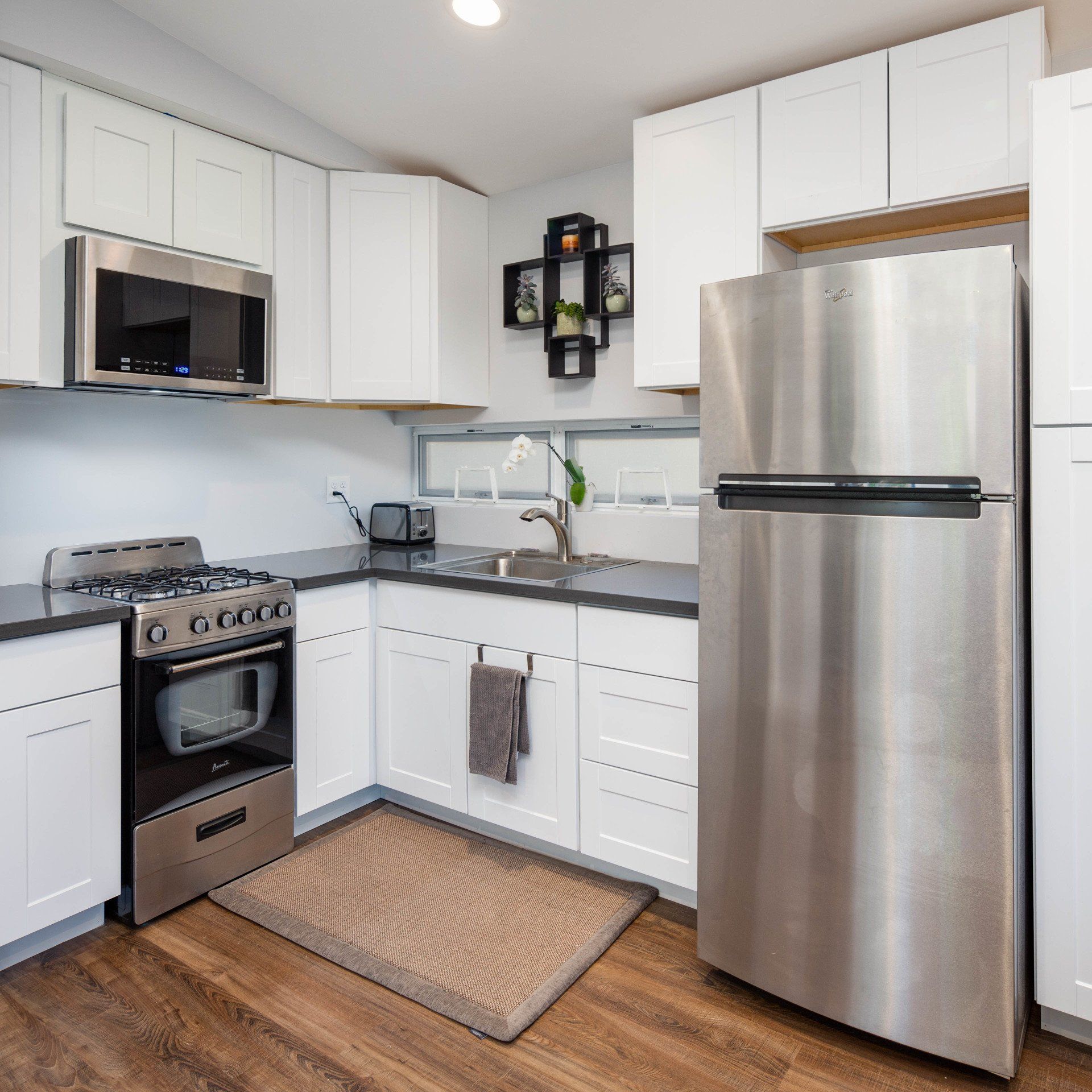The addition of an attached 480 sq. ft. ADU to an existing residence. The ADU has an open plan living room, dining room and kitchen with a separate bedroom with bath and full laundry. The entry deck looks out onto the creek that borders the property.